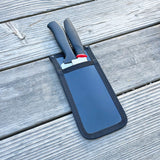 Our Small Utility Organizer features (3) levels of sleeves (front, middle, and rear) capable of holding a 10" utensil. One large pocket to accept a 10" x 10" cutting board, two zippered pockets for up to an 11" utensil, two elastic net pockets, a bottle opener built-in, and two different options for hanging.