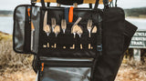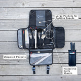 This Camp Kitchen Organizer has multiple elastic sleeves for silverware, a protective sheath for sharp knives, two zippered pouches, and two large pockets for cutting boards.